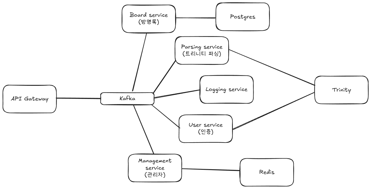 각 서비스들은 서로 통신을 위해서 절대 직접적으로 연결되지 않고 무조건 kafka를 거친다.